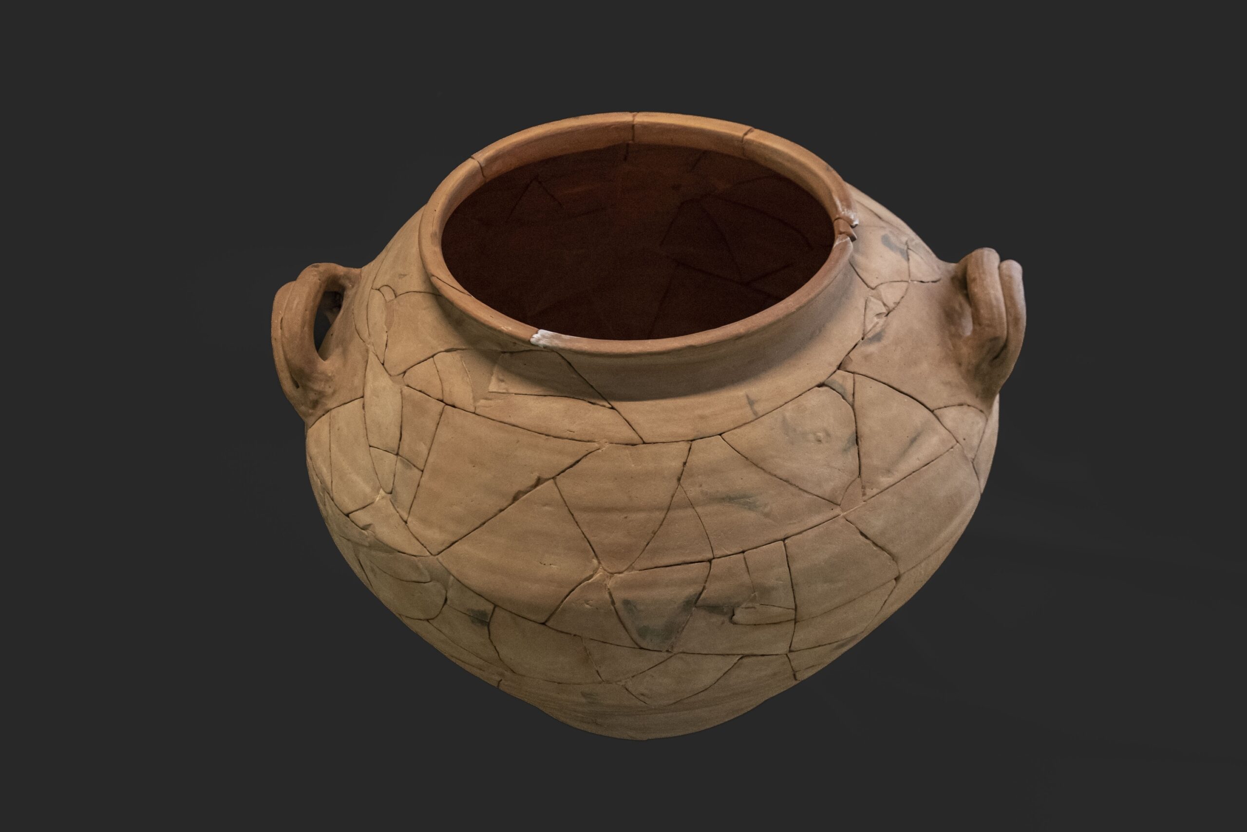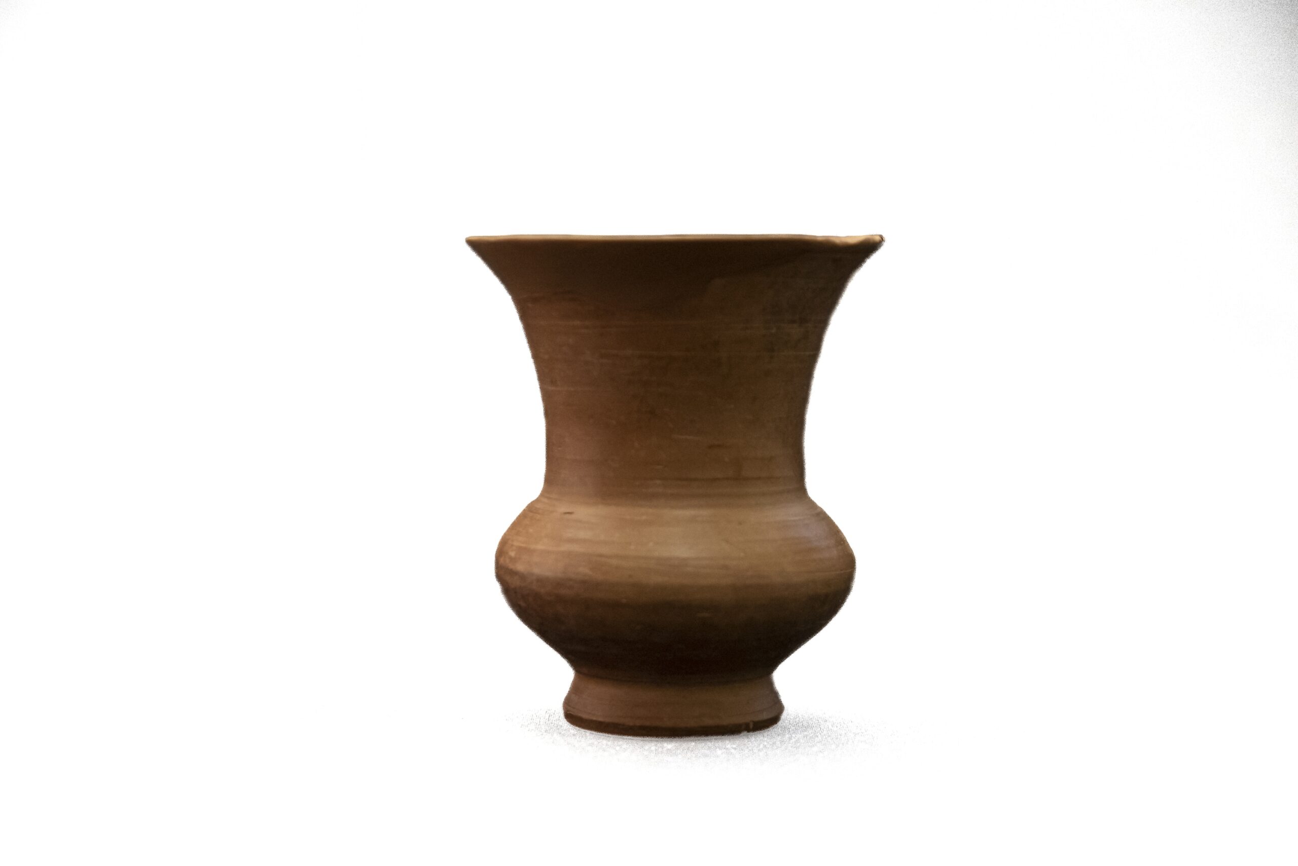 Petit vas de cocció oxidada de forma cilíndrica similar a un càlat amb la vora exvasada i llavi arrodonit amb una nansa vertical amb solc central. Malgrat tant sols es conserva un fragment de la peça, es pot observar entre dues bandes decorades en ziga-zaga verticals, una fulla d'heura sobre la qual hi ha una au. La decoració conclou amb dues bandes paral·leles a la zona inferior. La nansa també està pintada amb filets horitzontals paral·lels. L'au que apareix en la decoració d'aquest vas ha esdevingut el símbol del Museu de Cerdanyola i ha estat reproduït en diversos materials que formen part del marxandatge del Museu com tasses, samarretes, punts de llibre etc....